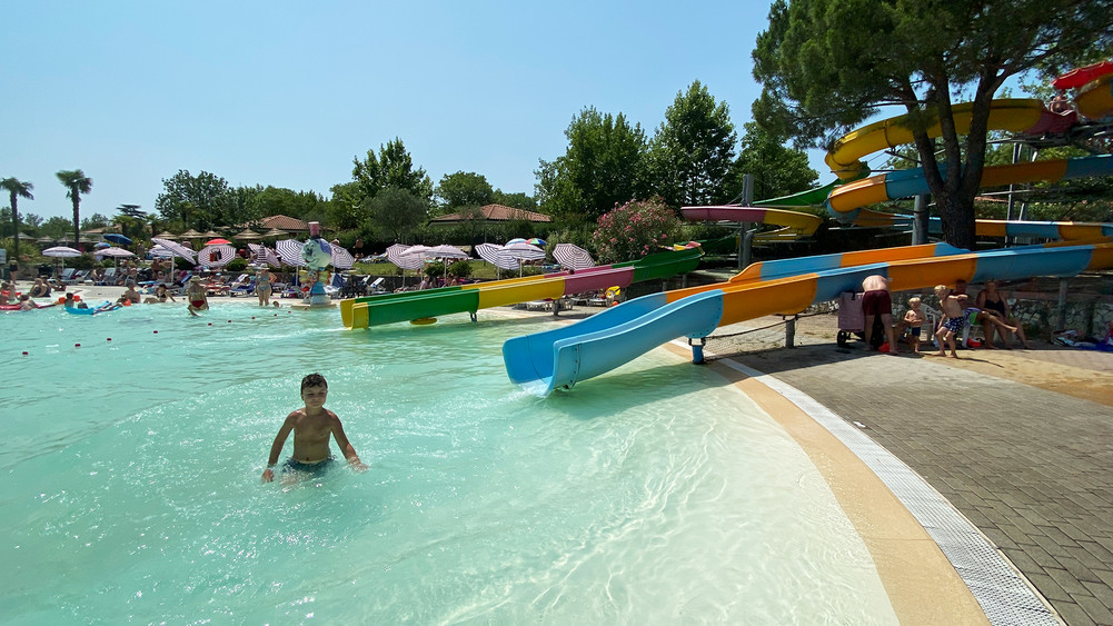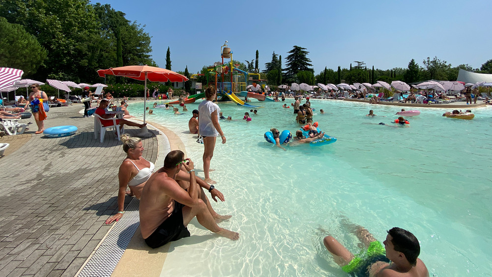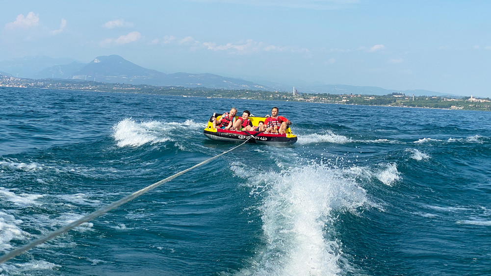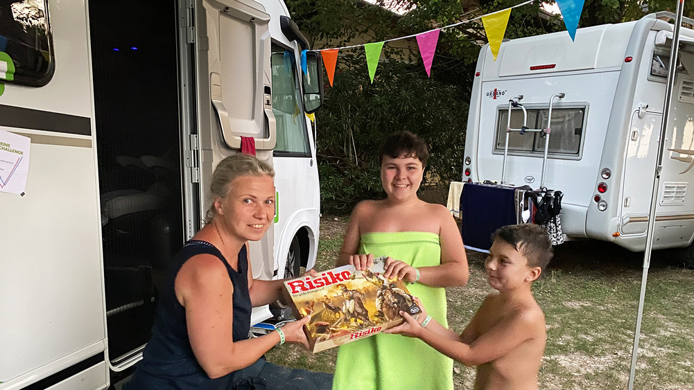 Jeden Tag können unsere Camper 100 Euro für ihre Urlaubskasse erspielen. Die erste Tagesaufgabe für unsere Urlauber: Blubbert "Erbarme zu spät die Hesse komme" im Gardasee. Und wir können bestätigen: Sie haben es geschafft! Und dabei sogar einen Zahn geopfert!