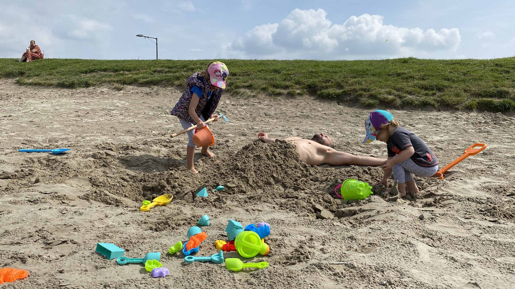 Die erste Aufgabe für unsere Familie Paul: Buddelt euren Papa in den Sand ein und dekoriert ihn schön. Vater Patrick ist bei dieser 1. Challenge von uns auf jeden Fall fast vom Strand verschluckt worden. Good Job, Pauls!