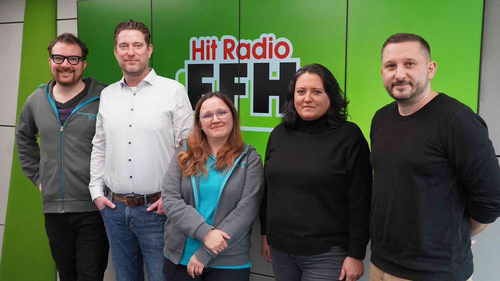 Die VGF-Kollegen, die uns im FFH-Studio besucht haben. Von links: Fabian Hamm, Knut Müller, Manuela Siering, Joanna Günther und Nebojsa Mitrovic.