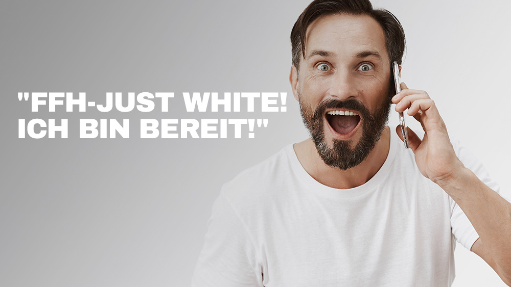 Denn wenn das Telefon klingelt und FFH anruft, geht unbedingt ran und begrüßt uns mit dem Satz: "FFH-Just White! Ich bin bereit!".