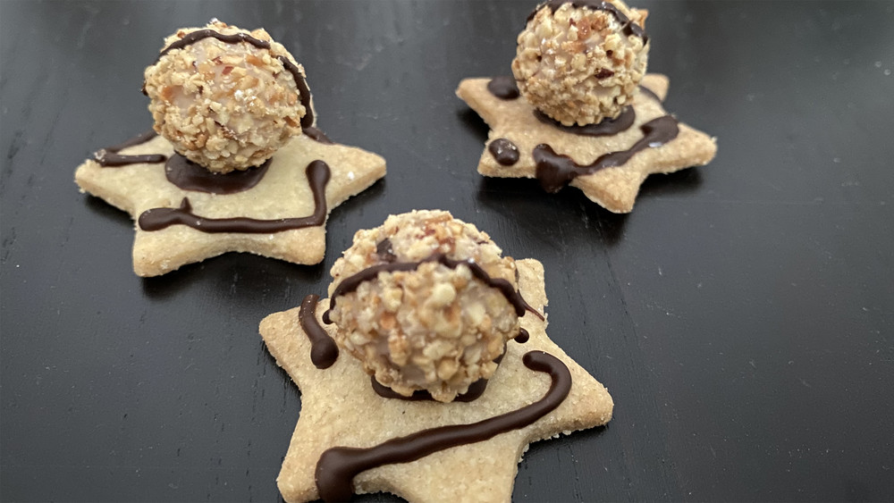 - In der Zwischenzeit schmelzt ihr die Kuvertüre über einem Wasserbad und "klebt" dann je eine Giotto-Kugel mit einem Klecks geschmolzener Kuvertüre auf jeden Stern