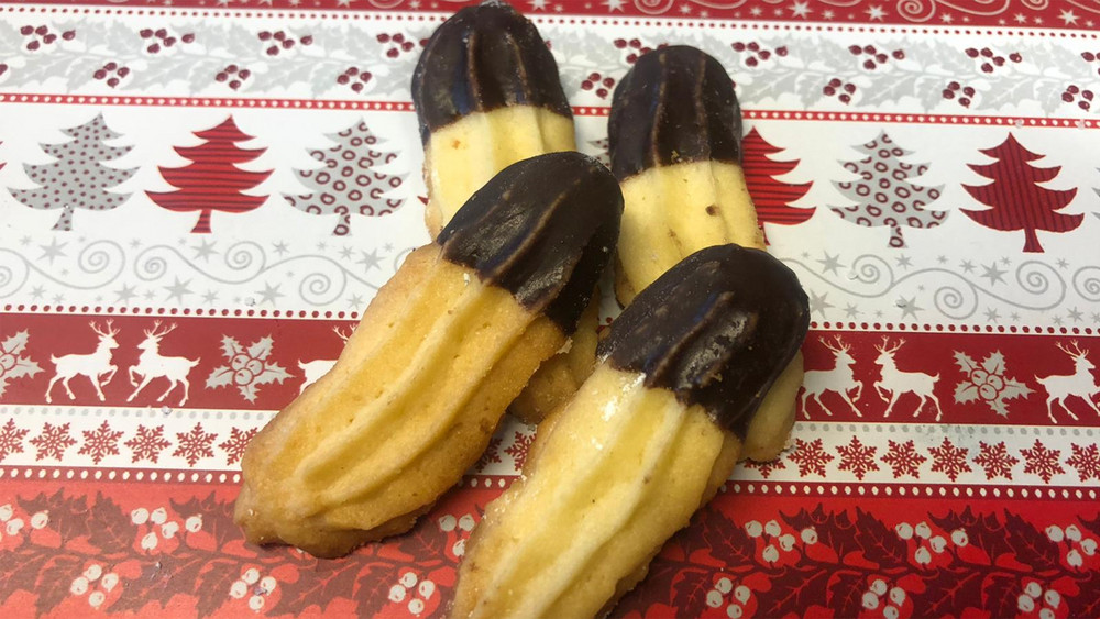 Anmerkung von Julia: "Diese Plätzchen backt meine Mami immer - für mich dann ohne die Schoko-Enden. Fairerweise muss ich zugeben, dass die Marzipanstangen in meiner Plätzchen-Rangliste ganz unten stehen, aber bei Gästen kommen sie immer super an!"