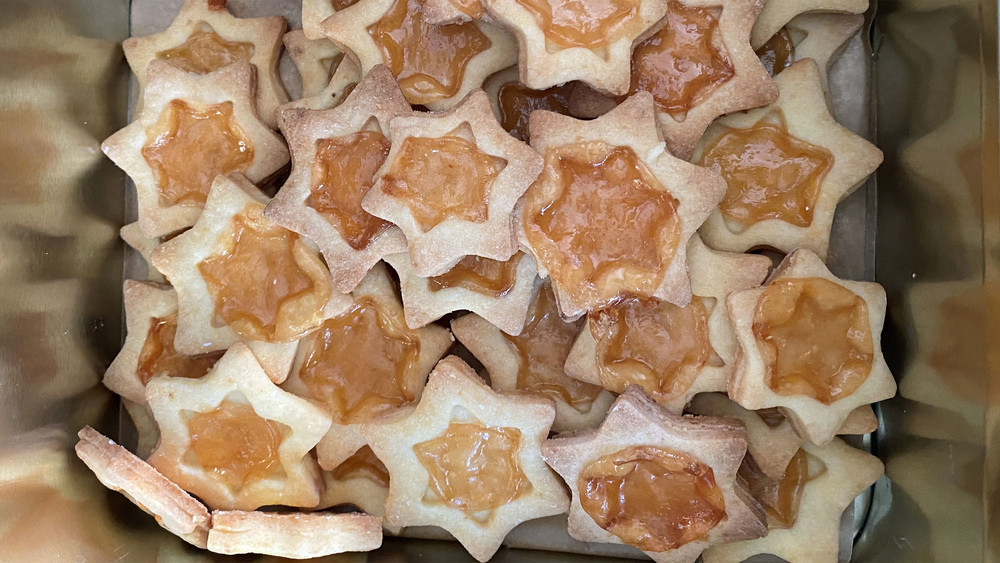 - Wenn die Plätzchen abgekühlt sind, streicht ihr auf die Sterne ohne Loch etwas Mangomarmelade