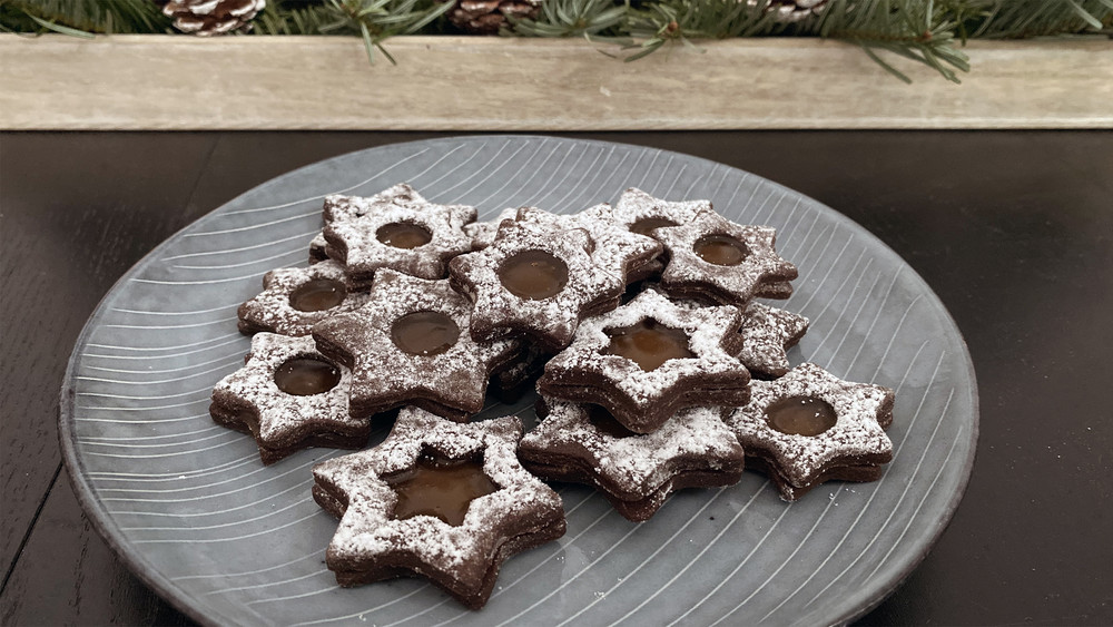 - Vermischt etwas Puderzucker mit Kakao und siebt es über die Sterne mit Loch. Die setzt ihr anschließend als "Deckel" auf die mit Mangomarmelade bestrichenen Sterne