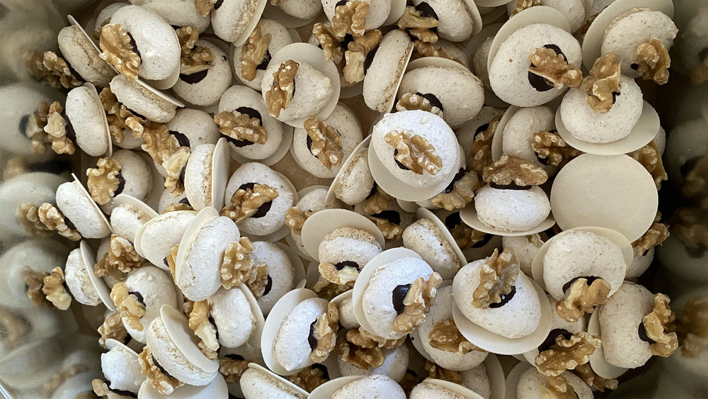 - Wenn die Makronen ausgekühlt sind, schmelzt ihr etwas Kuvertüre überm Wasserbad, gebt einen kleinen Klecks auf jeden Makrone und klebt dann eine Haselnuss oder ein Stück Walnuss drauf