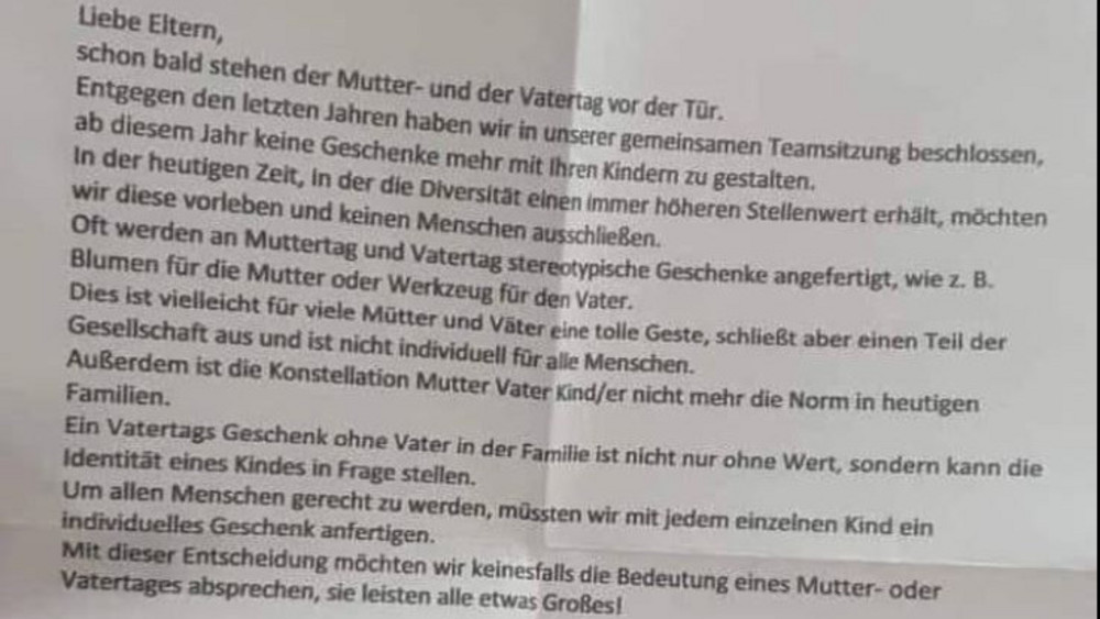 Die Kita im Amöneburger Stadtteil Mardorf hatte geschrieben, Diversität erhalte in der heutigen Zeit einen immer höheren Stellenwert, daher wolle man diese vorleben und keinen Menschen ausschließen. Deshalb wolle man in diesem Jahr auf stereotype Geschenke wie Blumen für die Mutter oder Werkzeug für den Vater verzichten.