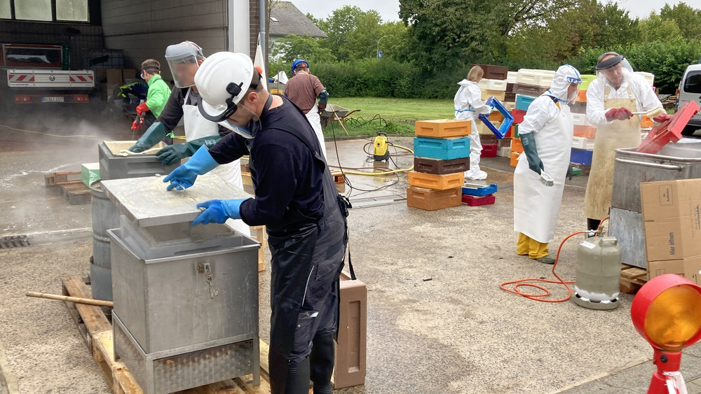 Eine Seuche, kontaminierte Waben und viel Mithilfe: bei der Aktion im Landkreis Gießen/ Lich haben die mithelfenden Bienenfreunde befallenen Bienenvölker von kontaminierten Waben getrennt, Bienenbehausungen desinfiziert oder unschädlich entsorgt. Unter den Schutz- und Hygienevorkehrungen mussten Beutenteile und Geräte vor der Desinfektion von kontaminiertem Wachs und Kittharz befreit werden. Das Material wurde dann aufwendig in Desinfektionswannen mit heißer Natronlauge oder per Gasflamme gereinigt oder in einer extra ausgehobenen Brandgrube vernichtet. Die Bienenvölker wurden saniert und von Waben und Bienenbehausung (Beuten) getrennt. Bald bekommen die Bienen ein neues, desinfiziertes zu Hause.