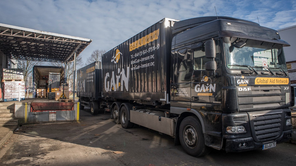 Ein Hilfsgüter-Konvoi von Gain in Gießen ist gepackt und steht zur Abfahrt bereit.