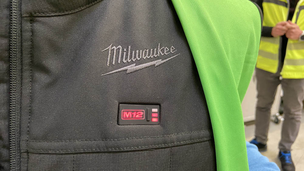 Das Thermometer in Abschnitt 3 von Logistikhalle 58 zeigt gerade mal 16 Grad an. Doch frierende Mitarbeiter sieht man hier nicht, obwohl sie nur recht dünne Pullis oder Westen tragen. Der Trick: Die Kleidung ist durchzogen von Heizfäden, in der Tasche steckt ein kleiner Akku, geladen über die - na klar - Solar-Anlage auf dem Dach. Gesteuert über eine App kann die Kleidung auf angenehme 35 Grad aufheizen.