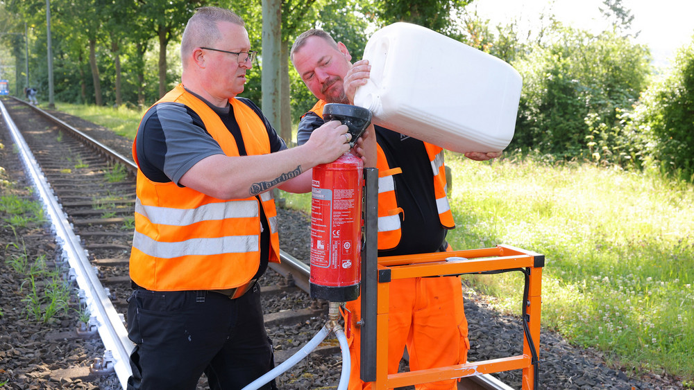 Die Farbe wird aber nicht händisch aufgebracht - sondern mit einem Gerät der Marke Eigenbau. KVG-Mitarbeiter haben das Gerät nach Vorbild aus Frankfurt gebaut: Das ist ein Metallgestell, das auf die Schienen gesetzt und dann mit Rollen darüber geschoben wird. In einen ausgedienten Feuerlöscher, der am Gestell befestigt ist, wird dann die weiße Farbe eingefüllt. Über zwei Schläuche fließt die Farbe dann in die Sprühpistolen, die die Schiene links und rechts an der Seite ansprühen.