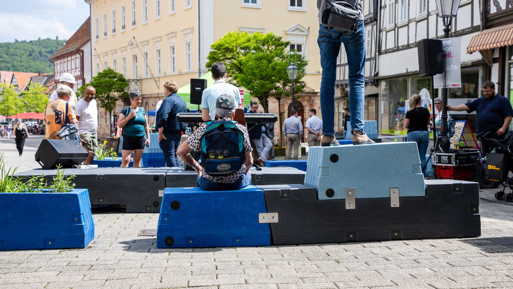 Sie sehen aus wie übergroße Lego-Steine in blau und grau und sind derzeit der Riesen-Aufreger in Eschwege: Die neuen Kunststoff-Möbel für die Innenstadt. Sie können zu Sitzbänken, Stehtischen oder einer Bühne zusammengebaut werden.