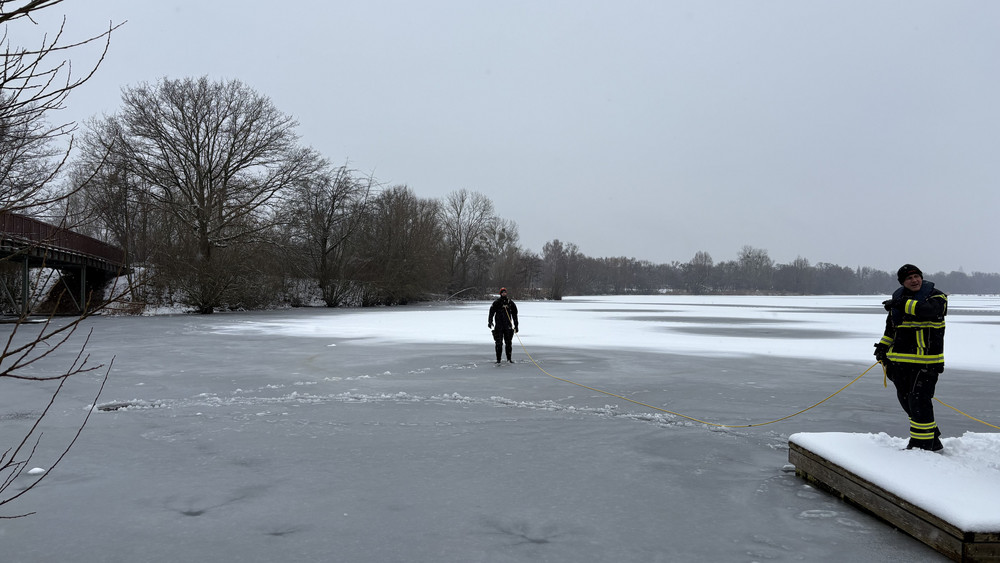 Ein Feuerwehrmann hat dazu Löcher in die Eisdecke geschlagen und ist dann ins 4 Grad kalte Wasser gesprungen – natürlich abgesichert und im Trockentauchanzug, sodass es nur vom Hals aufwärts kalt wurde. Die anderen Einsatzkräfte haben ihn dann etwa mit einer Stange vom Ufer aus oder mit einer Art aufblasbaren Trage gerettet. Und auch Tauchgänge unter dem Eis standen an.