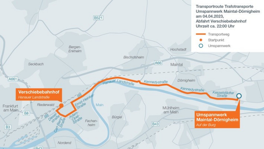 Um 22:00 Uhr soll ein Transformator für ein neues Umspannwerk in Maintal im Bereich der Hanauer Landstraße 443-447 auf die Straße gehen. Von dort aus tritt der Schwerlasttransport seine Reise zur Zieldestination "Auf der Burg" in Maintal an. Die Frankfurter Polizei wird den Transport begleiten.