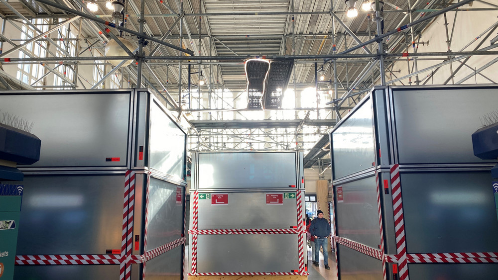 Die silbernen, bis zu drei Meter hohen Wände stehen direkt am Eingang der Bahnhofshalle und versperren den Blick auf die Unterführung. Fast im Minutentakt kommen Pendler, die erst einmal etwas fragend um die Ecke schauen, berichtet unser Reporter vor Ort.