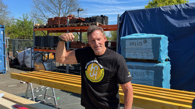Der 67-Jährige besuchte jetzt den Dachdecker-Betrieb Nolte in Frankfurt. Dort bekam er einen Einblick in die alltägliche Arbeit, durfte gemeinsam mit Hessens Ministerpräsident Boris Rhein einen Holzbalken sägen und eine Schieferplatte zurechtschlagen.