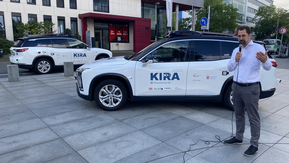 Im selbstfahrenden Auto von A nach B: In Südhessen wird das im öffentlichen Nahverkehr getestet – eine Premiere in Deutschland. Autonom fahrende Autos transportieren ab September auch in Darmstadt die ersten Fahrgäste. Das Pilotprojekt mit dem Namen "Kira" wurde am Dienstag (2.9.) in Darmstadt vorstellt.