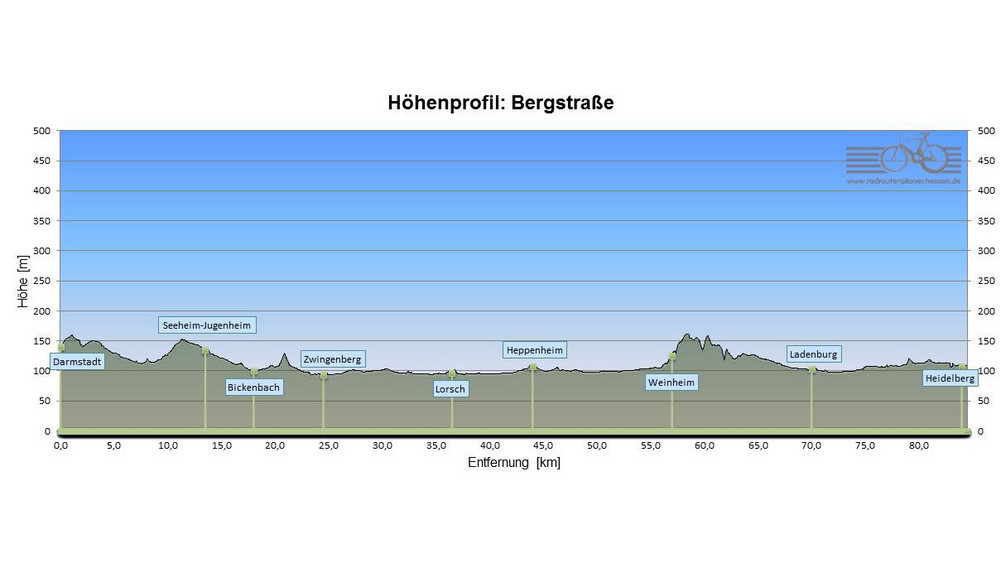 Auf mehr als 83 km können Sie die Bergstraße per Rad erkunden und dabei den mediterranen Charme dieser unvergleichlichen Landschaft kennen lernen. Besonders lohnenswert entlang der Radstrecke ist ein Besuch der wie eine Perlenschnur aufgereihten Städte und Gemeinden, die eine Vielzahl von Sehenswürdigkeiten zu bieten haben.