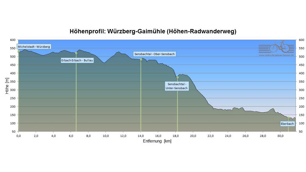 Der 21 km lange Radwanderweg läuft auf einem Höhenrücken des Odenwaldes. Kleine Steigungen und Gefällstrecken wechseln sich auf der überwiegend durch Waldgebiete geführten Strecke. Lediglich auf der Strecke zwischen Ober-Sensbach und Gaimühle ist eine längere Gefällstrecke zu bewältigen. Unterwegs sollte man Verweilen und die herrliche Aussicht über das Odenwälder Mittelgebirge genießen.