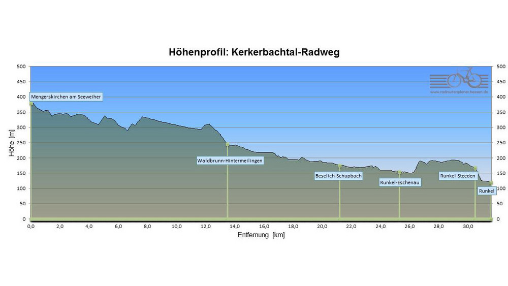 Der Radweg durch das Kerkerbachtal von Mengerskirchen im Westerwald nach Runkel an der Lahn folgt weitgehend der Trasse der ehemaligen Kerkerbachbahn. Die Route verläuft bis auf wenige Abschnitte auf oder neben der stillgelegten Bahnstrecke. Der Weg ist nicht durchgehend asphaltiert, aber gut zu befahren. Streckenweise verläuft der Kerkerbachtal-Radweg auf dem Hessischen Radfernweg Nr. 8.