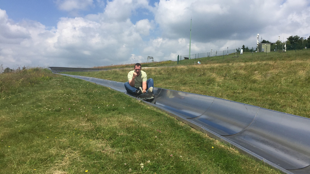 FFH-Reporter on Tour: Olaf Brinkmann brettert die Sommerrodelbahn auf dem Hoherodskopf runter.