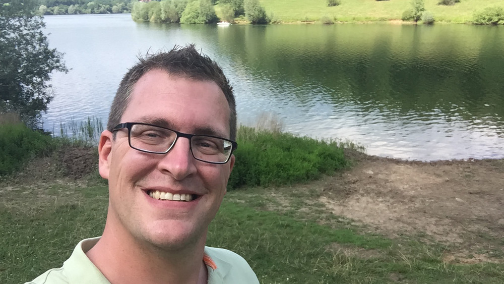 Erstmal chillen, abkühlen und ein bisschen "Musik" auf Grashalmen machen: FFH-Reporter Olaf Brinkmann am Niddastausee bei Schotten.