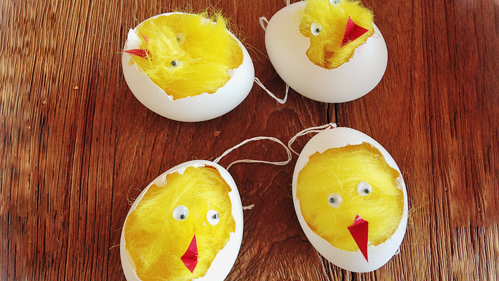 Ei auspusten und das Loch mit einer Pinzette aus der Schale herausbrechen. Tipp: Die Fläche vorher mit einer Nadel perforieren. Anschließend einfach gelbe Watte in das Ei füllen, Augen und einen kleinen Schnabel aufkleben - fertig!