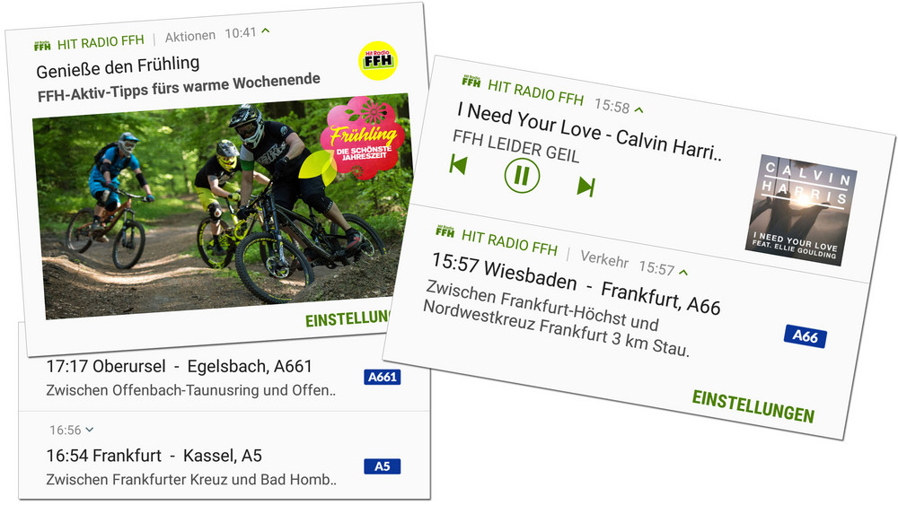Push-Benachrichtigungen werden in den Kanälen News, Verkehr, Aktionen und Schulausfälle gruppiert. Das ist übersichtlicher. Beim Verkehr stehen die Autobahn-Nummern als Icon dabei und man kann die Push-Meldung ausklappen, um den ganzen Text zu lesen. Infos zu FFH-Aktionen und Nachrichten werden mit einem Bild gepusht. Das funktioniert ab Android 7.