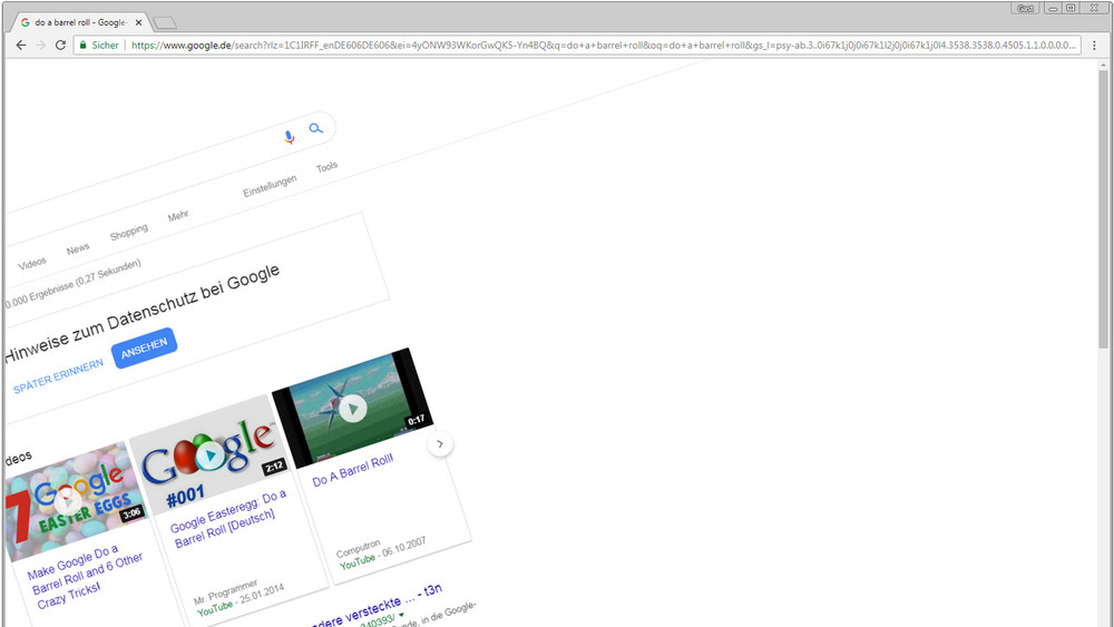 Wer es noch extremer mag, gibt "do a barrel roll" in die Suche eingeben und schon dreht sich der komplette Bildschirm. "Barrel roll" ist in der Fliegerei eine Figur, bei der der Pilot mit seiner Maschine einen Überschlag fliegt.