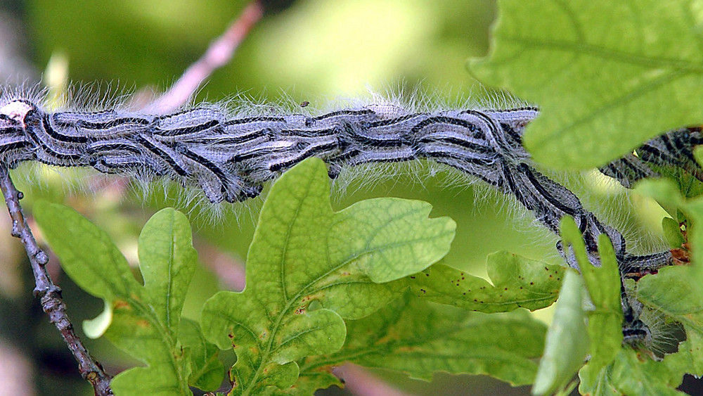 Eichenprozessionsspinner. Der Name der Raupe sagt genau das aus, was sie tut und wohin die Reise für sie am liebsten geht. Nämlich Richtung Eichen. Und Prozession, weil sich die kleinen Tierchen in größeren Gruppen kriechend, wie bei einer Prozession, von Eichen aus auf Nahrungssuche begeben und dann wieder zur Eiche zurückkehren. Oder eben direkt in ihrer Eiche bleiben und dort fressen.