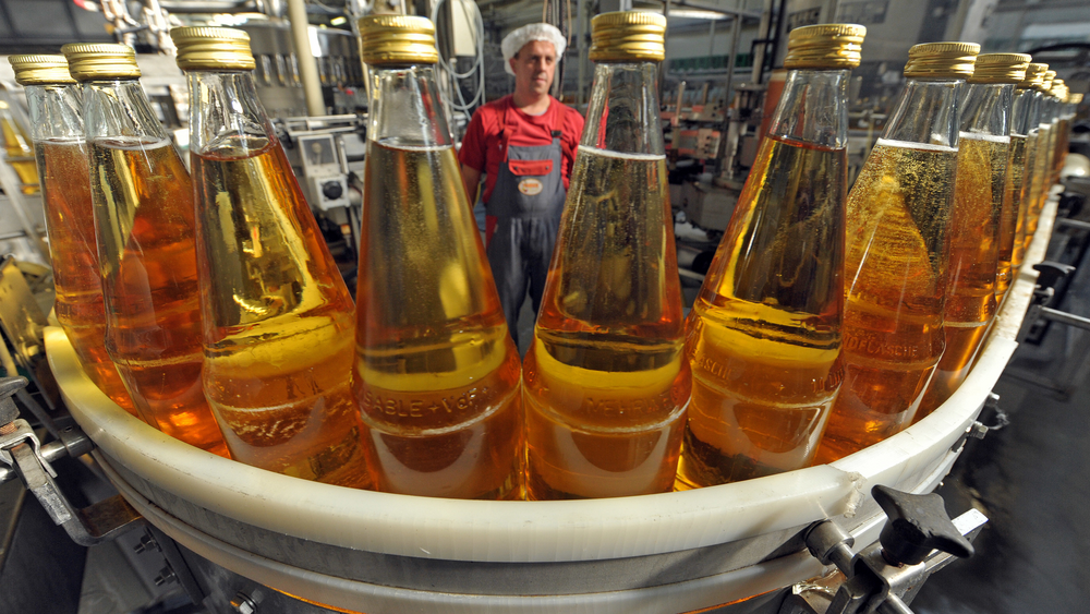 Für 100 Kilo Äpfel könnt ihr 50 Liter Getränke im Laden bekommen. Zum Beispiel Apfelwein oder Apfelsaft für 0,65 Euro pro Liter.