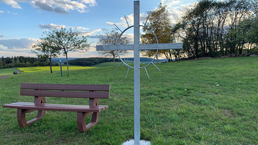 Der Rundweg ist rund 9 Kilometer lang und führt zum Beispiel an einer tollen alten Mühle, an einem kleinen Fluss und vielen Feldern vorbei. Es gibt viele Sitzbänke zum Durchschnaufen - zum Beispiel am Gipfelkreuz am höchsten Punkt der Tour. Von da aus gibt es einen tollen Blick in die Landschaft - bei gutem Wetter bis zum Hoherodskopf.