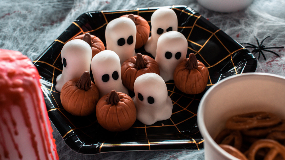 Mindestens genauso süß sind kleine Geister aus Marshmallows und Fondant. Dazu einfach die Fondant-Masse ausrollen und mit einer Tasse oder einem Glas Kreise ausstechen. Den Kreis legt ihr dann über die Marshmallows und drapiert es so, dass es wie ein Geist aussieht. Wer möchte kann mit schwarzer Zuckerschrift oder Schokoglasur ein Gesicht aufmalen.