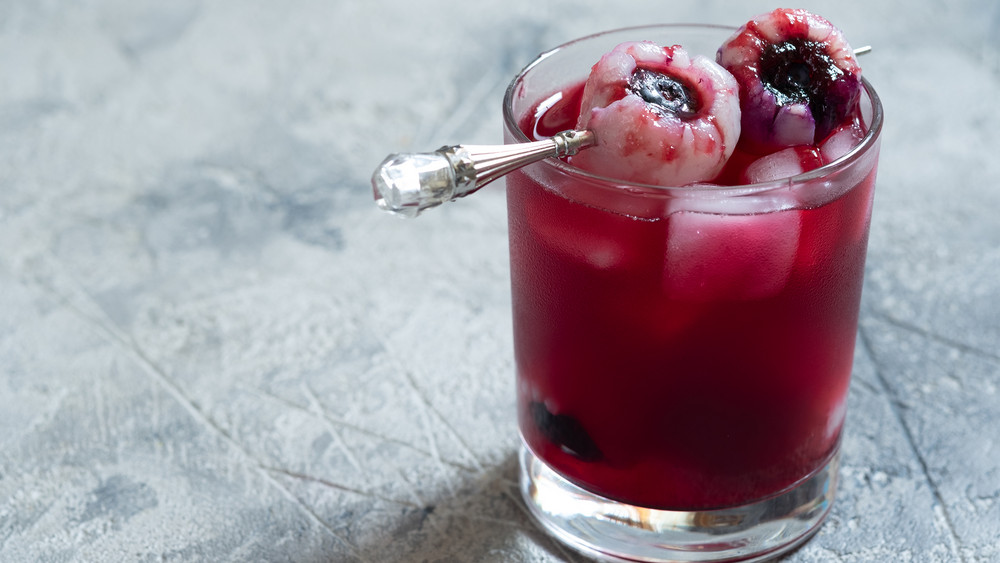 Mit etwas rotem Sirup kommen jetzt noch die "Adern" aufs Auge. Die Augen könnt ihr auch auf einen Cocktailspieß stecken und so eure Halloween-Getränke dekorieren.