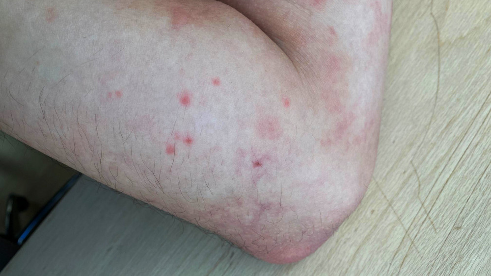 Typisches Bild bei Milbenbissen: Viele kleine, juckende rote Pusteln