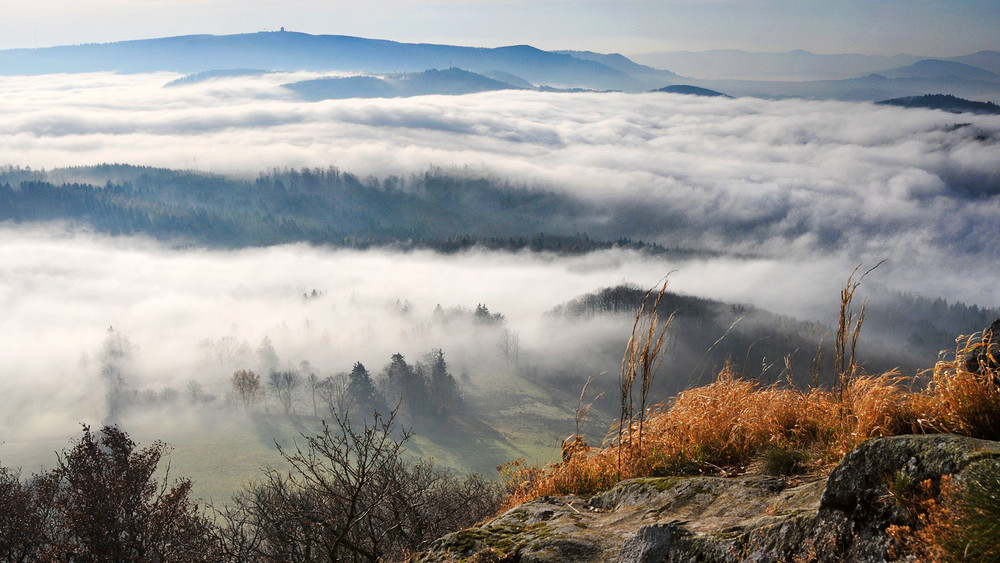 Der Herbst bietet eine Natur, wie man sie nicht so oft sieht. Sonnenstrahlen lassen die Natur in einem goldenen Glanz erscheinen. Außerdem kann es im Herbst vermehrt zur sogenannten Inversionswetterlage kommen. Dabei sind die Täler oft über den gesamten Tag in dicken, kalten Nebel gehüllt. Dafür ist es auf dem Gipfel der Wasserkuppe oft angenehm mild, fast windstill und sonnig.