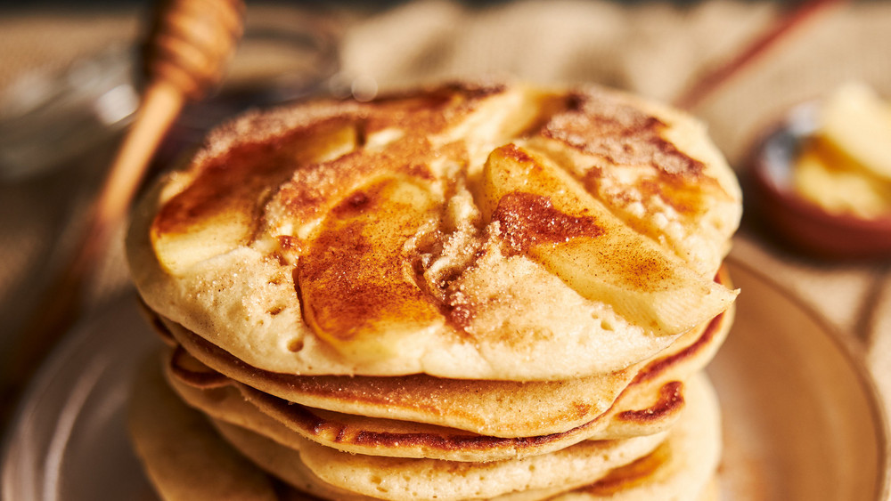 Mehl, Zucker und 1 Prise Salz mischen und dann mit Eiern und Milch zu einem glatten Teig verrühren. Den Teig für ca. 10 Minuten quellen lassen. Die Äpfel waschen und vierteln, das Kerngehäuse entfernen und Viertel in dünne Spalten schneiden. 1 TL Butter in der Pfanne schmezlen, ein Viertel des Teiges in die Mitte geben und nach außen hin verteilen. Ein Viertel der Apfelspalten auf dem Teig verteilen. Einen Deckel auf die Pfanne machen und den Teig bei mittlerer Temperatur für ca. eine Minute stocken lassen. Den Pfannkuchen wenden und 1-2 Minuten weiterbacken. Auf dieselbe Art mit den restlichen Zutaten weitermachen.