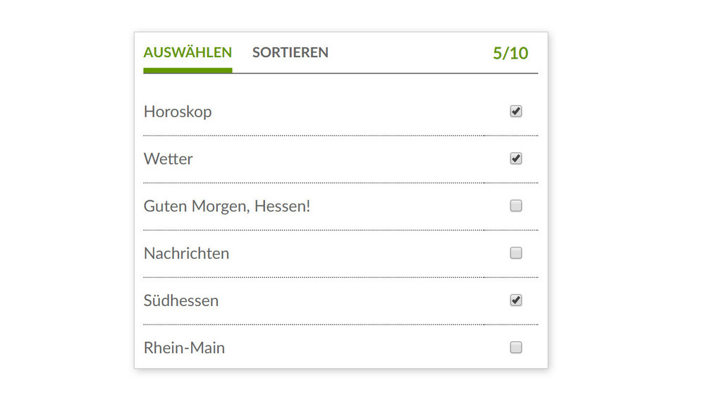 Horoskop, Wetter, „Guten Morgen, Hessen!“, Regionalnachrichten, Staupilot, Blitzer, Sport, Veranstaltungs-Tipps, Promi-News oder die neuesten Comedys und Podcasts.