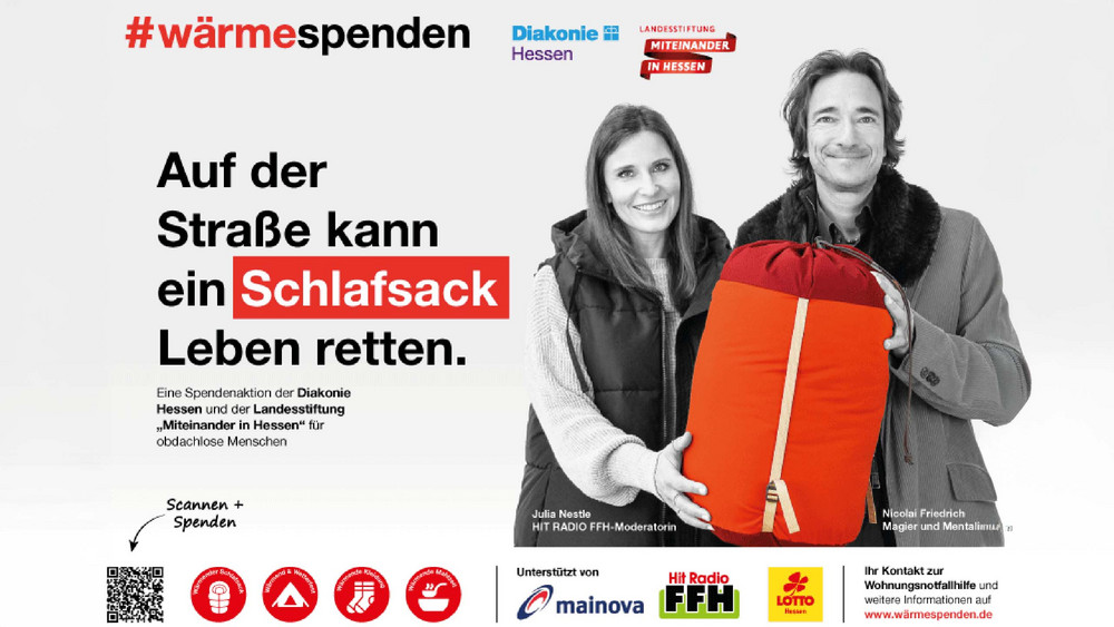 Unterstützt wird die Aktion wieder von HIT RADIO FFH und FFH-Moderatorin Julia Nestle ist erneut als Botschafterin dabei. „Die Aktion #wärmespenden bedeutet für mich auch Hoffnung schenken“, sagt sie. „Ich wohne in Frankfurt und sehe dort vor allem in den Wintermonaten täglich den Kampf gegen die Kälte bei wohnungslosen Menschen. Man darf nicht wegschauen! Wenn schon ein Schlafsack ein Leben retten kann, dann ist es etwas, das man auf alle Fälle unterstützen sollte.“
