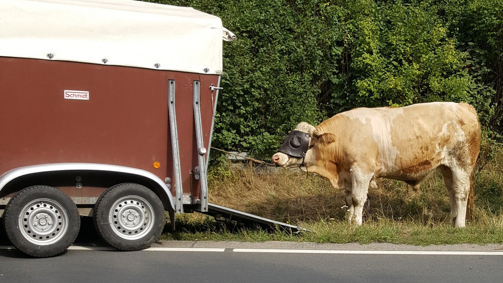 In Ludwigsau, Osthessen, ist ein junges Rind ausgebüxt. Das etwa acht Monate alte Tier entkam von einem Tieranhänger beim Verladen. Auf seiner Flucht überquerte das Rind eine Bundesstraße, rannte über Bahngleise und schwamm durch die Fulda. Danach lief es in Richtung Wald.