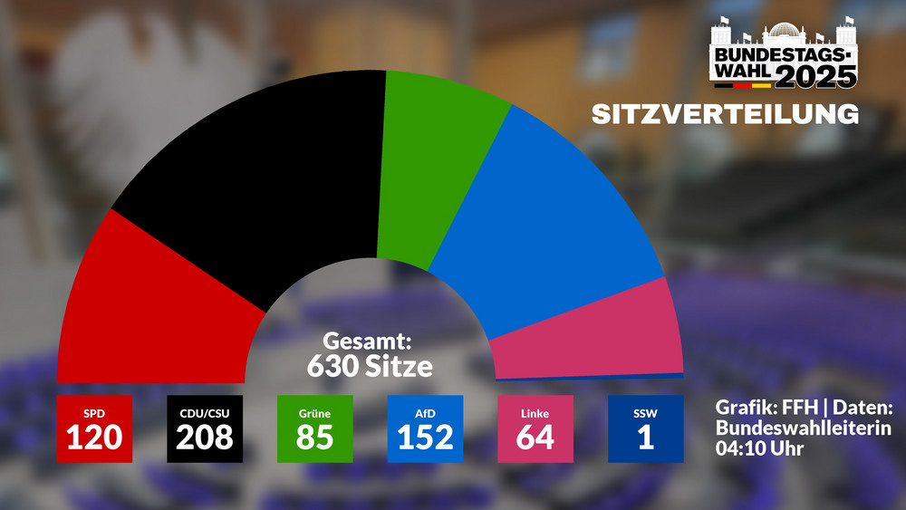 Die Union kommt auf 28,6 Prozent. Die AfD erreicht 20,8 Prozent, die SPD erzielt mit 16,4 Prozent ihr schlechtestes Ergebnis bei einer Bundestagswahl. An vierter Stelle folgen die Grünen mit 11,6 Prozent, und auch die Linke ist mit 8,8 Prozent sicher im Bundestag vertreten. Raus ist die FDP mit 4,3 Prozent, das erstmals angetretene BSW verpasst den Sprung ins Parlament denkbar knapp mit 4,97 Prozent.