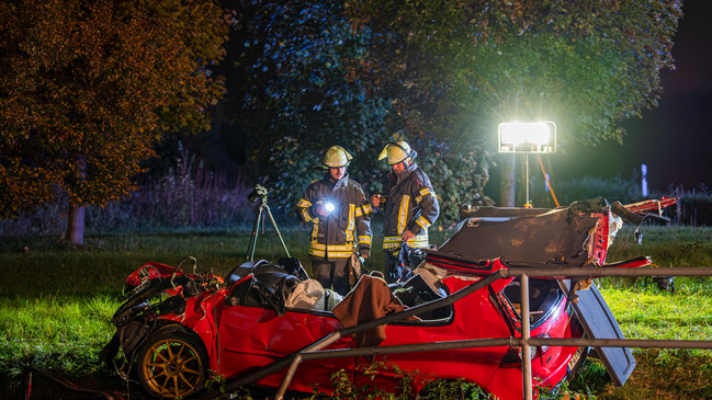 Der Wagen durchbrach ein Metallgeländer, wobei der Motorblock herausgerissen wurde und auf der Straße landete. Der Fahrer war im Fahrzeug eingeklemmt und musste von der Feuerwehr aufwendig befreit werden.
