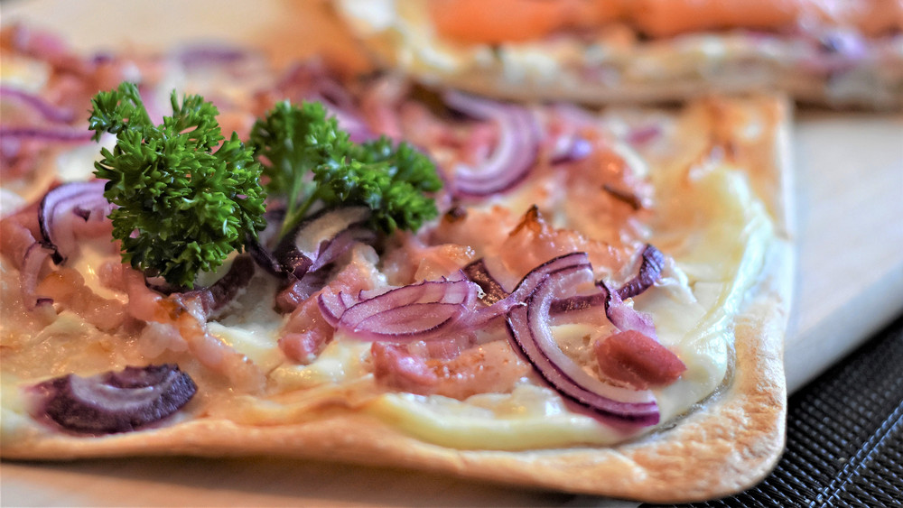 Flammkuchenteig, Schmand, frischer Dill, Räucherlachs, rote Zwiebeln
