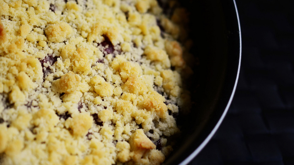 Anstatt herkömmlicher Streusel, nehmt ihr als Basis einfach Plätzchen (Buttergebäck, Vanillekipferl, Spekulatius, Spritzgebäck) und zerkleinert sie im Mixer. Dann verknetet ihr die Masse mit 150 g kalter Butter.