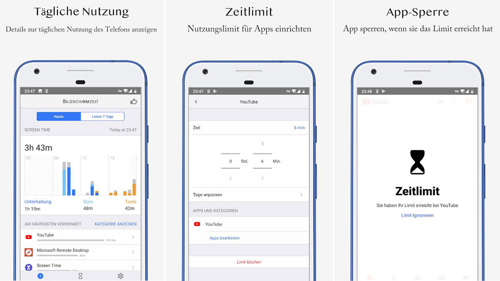In der Premiumvariante (für 3,39 Euro im Monat) kann man auch ein Zeitlimit für die tägliche Nutzung festlegen. Bestimmte Apps können sogar blockiert werden. Außerdem kann man dem Kind Aufgaben geben, wie zum Beispiel den Abwasch erledigen oder den Tisch decken. Wenn es die Aufgaben erledigt hat, kann es sich zusätzlich Zeit mit dem Smartphone verschaffen. Zu Schlaf- oder Schulzeiten kann das Handy außerdem gesperrt werden.