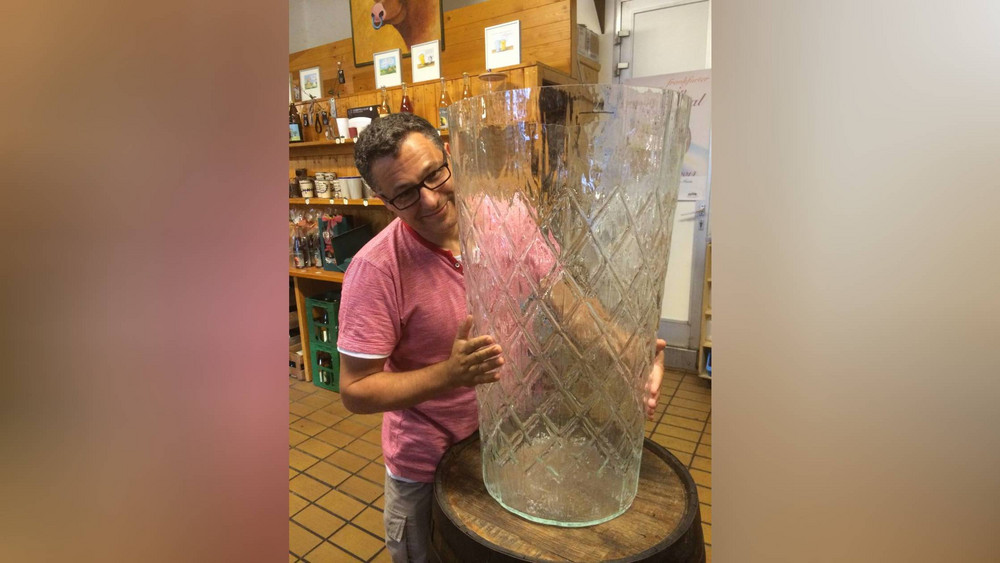 80 Liter Inhalt - das trinkt man nicht mal ebenso auf Ex! Dieses riesige "Gerippte" steht im Apfelweinzentrum Hanau. 75 Zentimeter ist es hoch und hat einen Durchmesser von einem halben Meter.