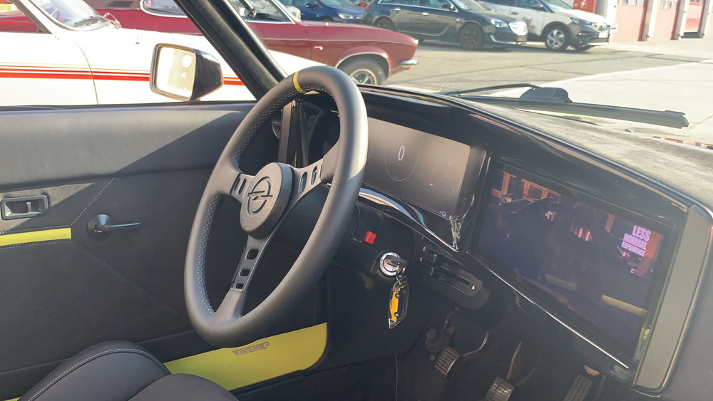 Es sind dann aber doch mehr Unterschiede zum damaligen Model zu finden, als nur der Elektromotor. Die Front zum Beispiel besteht aus einem großen LED-Bildschirm. Während der Fahrt leuchtet hier das Opel-Logo. Es kann theoretisch auch andere Dinge anzeigen. Auch im Innenraum ist vieles digitalisiert worden; ein Radio hat keinen Platz mehr gefunden, dafür große Displays, die Geschwindigkeit anzeigen und als Alternative für das fehlende Radio dienen.