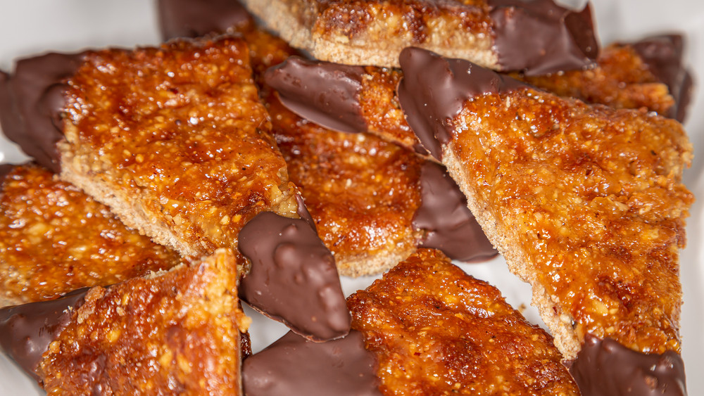 Auf dem Blech abkühlen lassen, dann in Ecken schneiden und in die geschmolzene Schokolade tauchen.