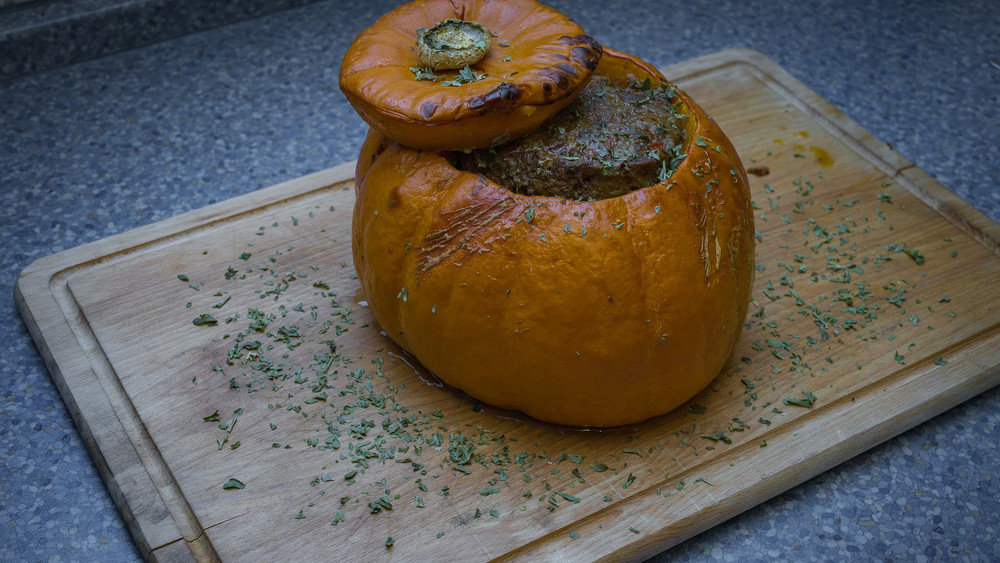 Prinzip gefüllte Paprika: Einen Hokkaido waschen, oben einen "Deckel" rausschneiden (aufheben) und den Kürbis vorsichtig ein bisschen aushöhlen - gut zwei Zentiemert Kürbisfleisch lassen. Mozarella, Zwiebeln und Paprika würfeln, ein bisschen Chili kleinhacken (je nach - ihr ahnt es - gewünschtem Schärfegrad), Emmentaler reiben. Alles zusammen mit Hackfleisch vermengen. Salz, Pfeffer, Ingwerpulver oder ganz klein gehackten frischen Ingwer, Oregano und ein bisschen Zucker dazu und die ordentlich verrührte Masse in den Kürbis. Deckel wieder drauf und ab in den Ofen. Bei möglichst indirekter Hitze im geschlossenen Grill (oder im Backofen) bei 180 bis 200 Grad eine Dreiviertelstunde bis Stunde garen - je nach Größe. Wenn fertig vierteln, ein paar Spritzer Kürbiskern-Öl drüber und heiß servieren - Guten Appetit!
