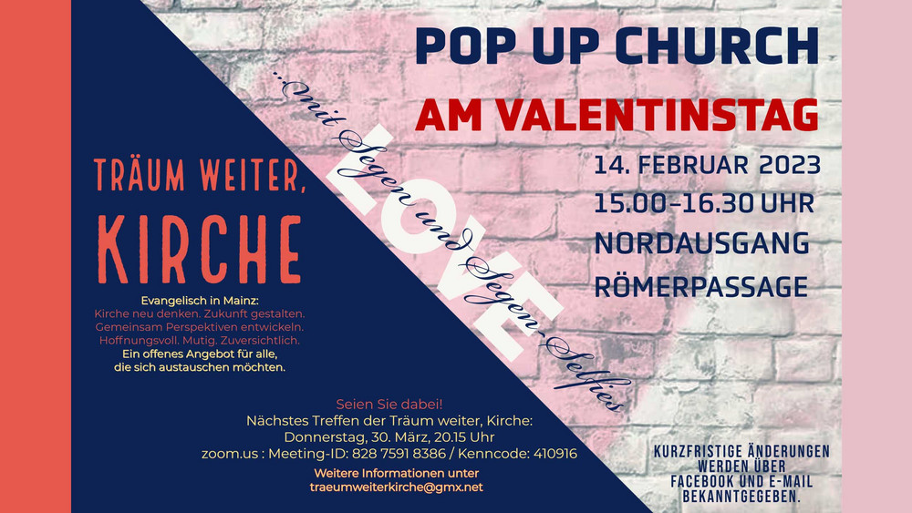 Die Evangelische Kirche plant eine Aktion zwischen 15.00 bis 16.30 Uhr. Hier wird es eine Fotowand geben. Wer mag, kann Selfies machen. Außerdem gibt es persönliche Segnungen von Paaren. Die Aktion findet am Nordausgang der Mainzer Römerpassage statt.
