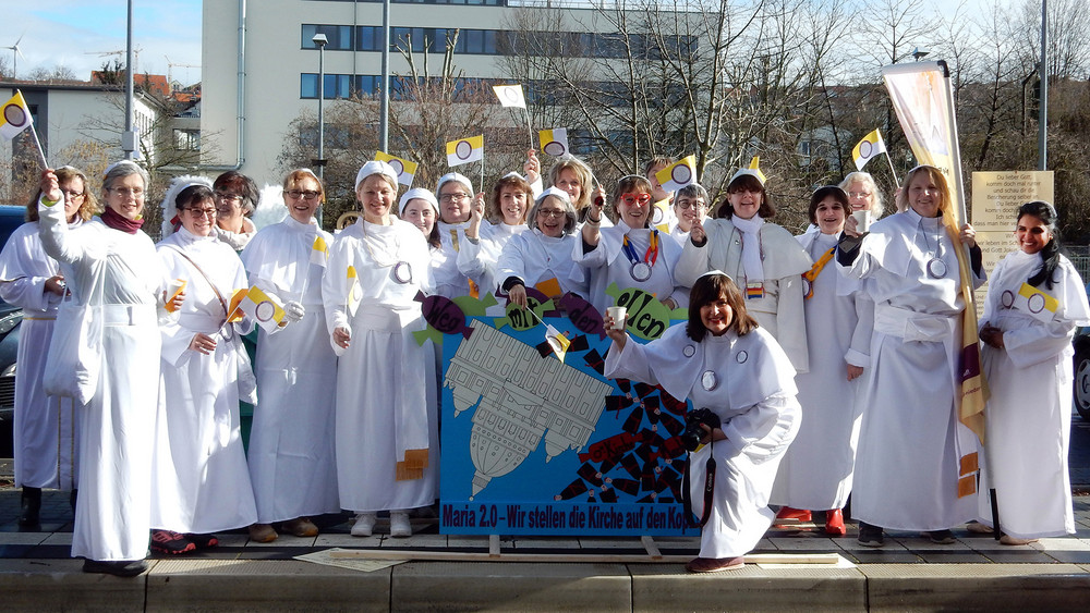Die Reformgruppe Maria 2.0 aus dem rheinhessischen Nieder-Olm ist mit einer eigenen Zugnummer beim Rosenmontagsumzug dabei. Verkleidet ganz in Weiß – als Päpstinnen und Päpste. Unter den 40 Teilnehmenden sind nämlich auch Männer mit dabei. Motto: „Wir stellen die Kirche auf den Kopf“. Sie wollen so auf humorvolle Art auf ihr Anliegen aufmerksam machen.